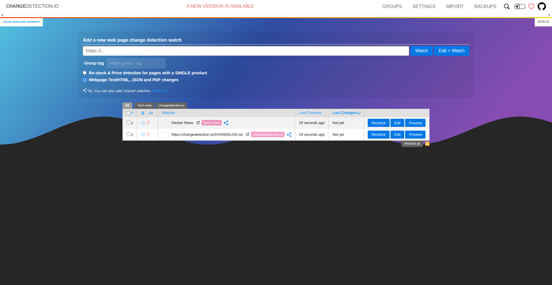 2025-10-06T07:45:00.426776588Z 2025-10-06 07:45:00.426 | DEBUG | changedetectionio.store:add_tag:585 - >>> Adding new tag - 'tech news'