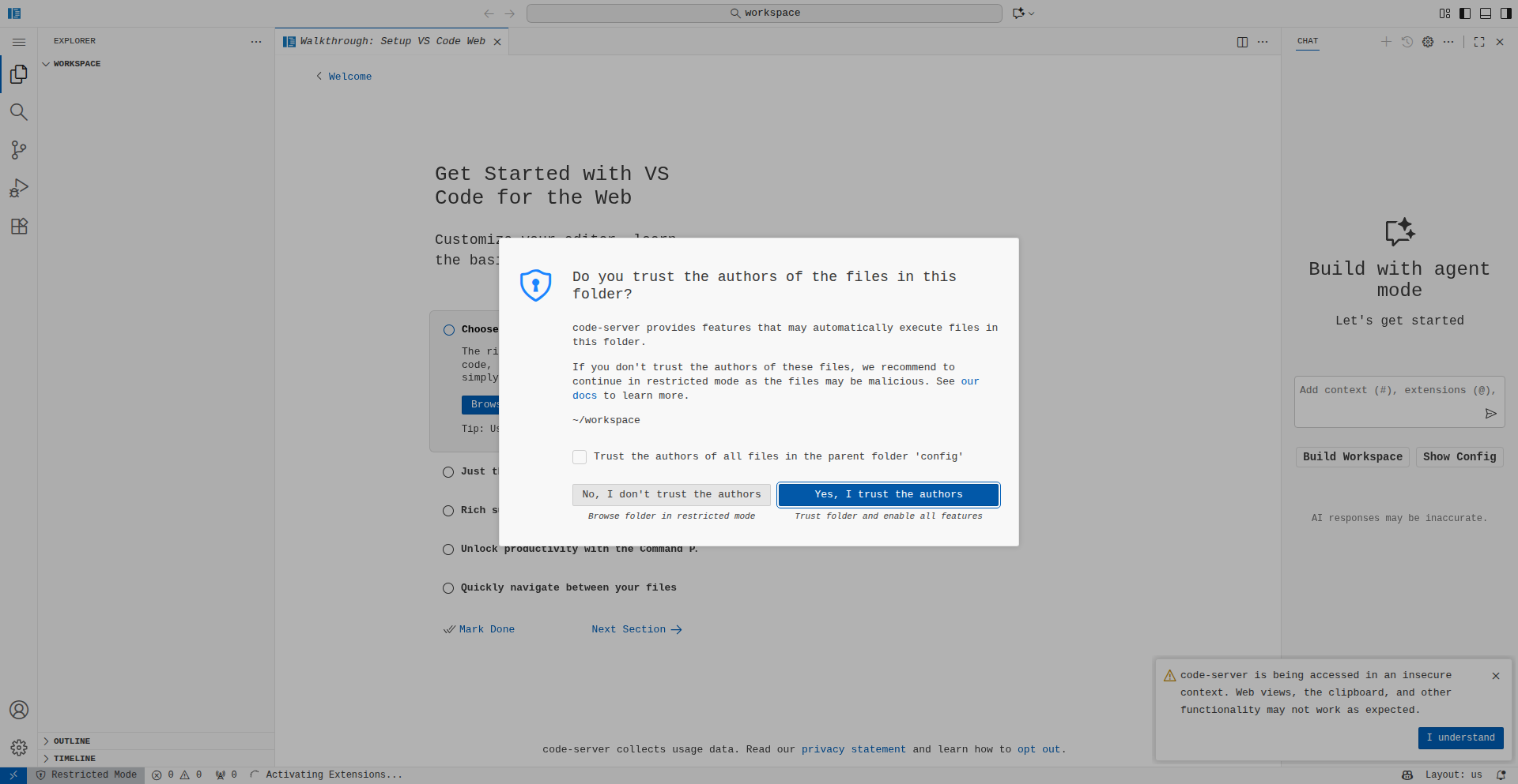 "message": "http://172.17.0.4:8443/stable-811ec6c1d60add2eb92446161ca812828fdbaa7f/static/out/vs/code/browser/workbench/workbench.js 3781:20839 \"AI generated workspace trust dialog contents not available.\"",