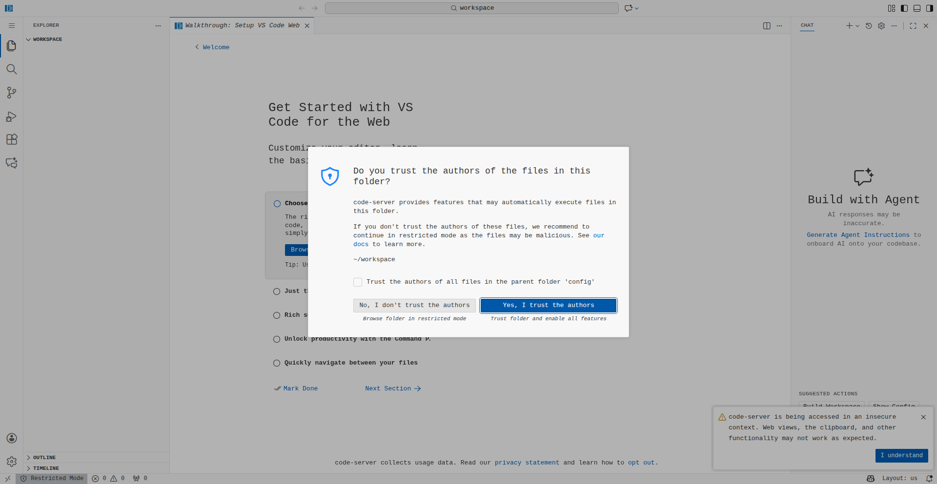 "message": "http://172.17.0.4:8443/stable-2ed1098c1ea3c30c557f6656cea7340e10cb3669/static/out/vs/code/browser/workbench/workbench.js 3836:20839 \"AI generated workspace trust dialog contents not available.\"",