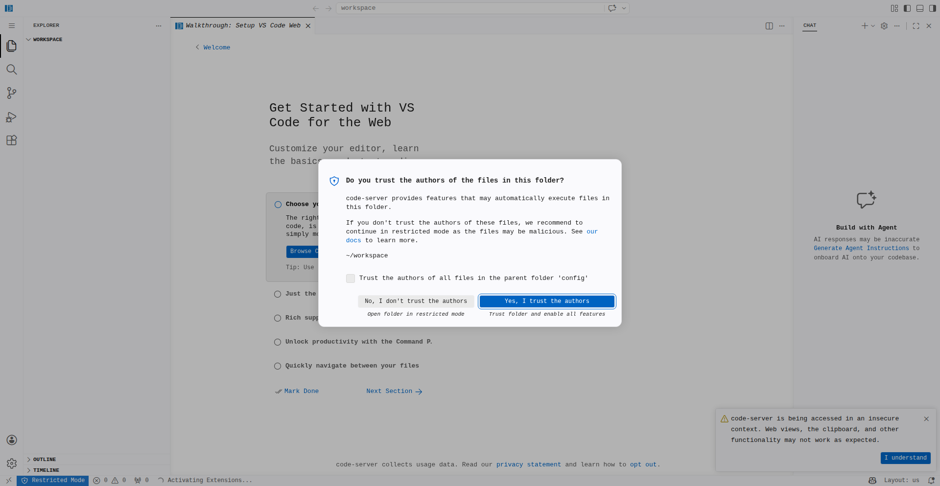 "message": "http://172.17.0.5:8443/stable-1c6fb2dc200eb57c5c7d612004e18a5e6ae8b0ed/static/out/vs/code/browser/workbench/workbench.js 4860:27062 \"AI generated workspace trust dialog contents not available.\"",