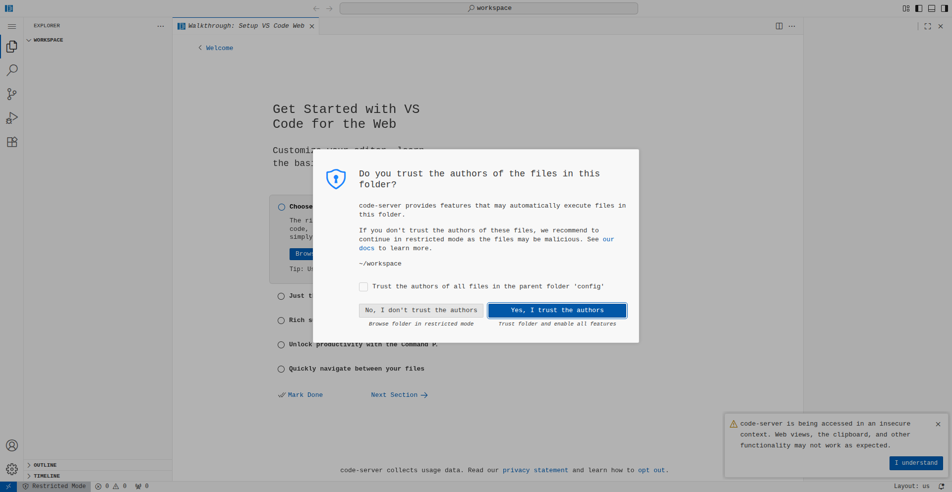 "message": "http://172.17.0.5:8443/stable-b0992ddb3e3b398371da6bcfbe21a70b4d66eb8d/static/out/vs/code/browser/workbench/workbench.js 3724:12032 \"The web worker extension host is started in a same-origin iframe!\"",