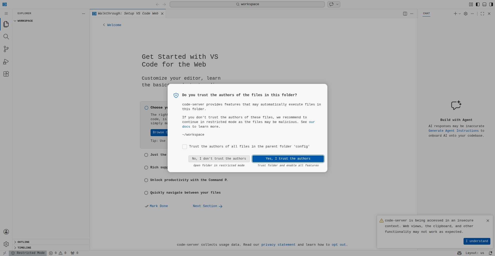 "message": "http://172.17.0.5:8443/stable-13ca0e47310505f4ab1ac59e891e9a3c5e5eec04/static/out/vs/code/browser/workbench/workbench.js 4552:21316 \"AI generated workspace trust dialog contents not available.\"",