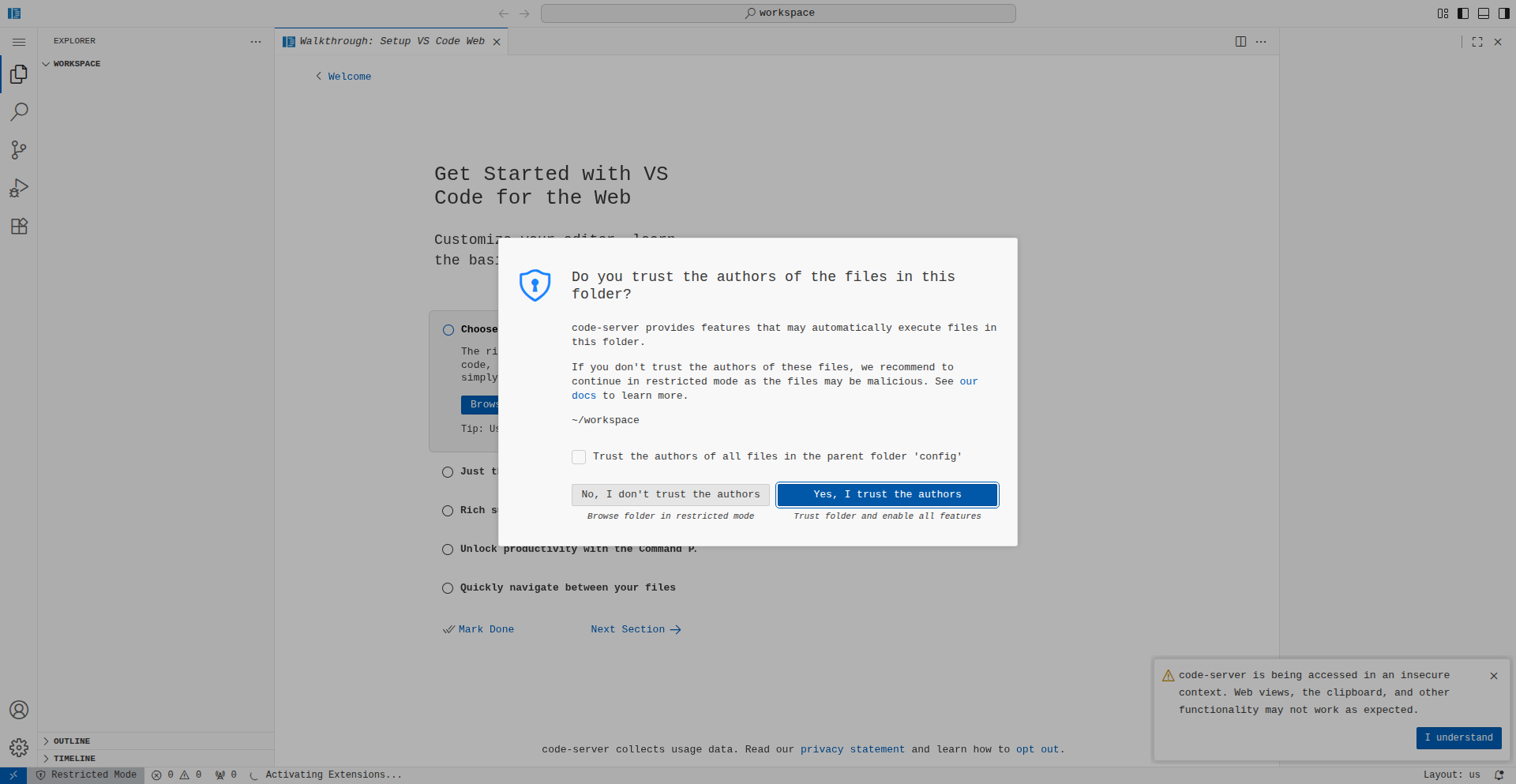"message": "http://172.17.0.4:8443/stable-b0992ddb3e3b398371da6bcfbe21a70b4d66eb8d/static/out/vs/code/browser/workbench/workbench.js 3724:12032 \"The web worker extension host is started in a same-origin iframe!\"",