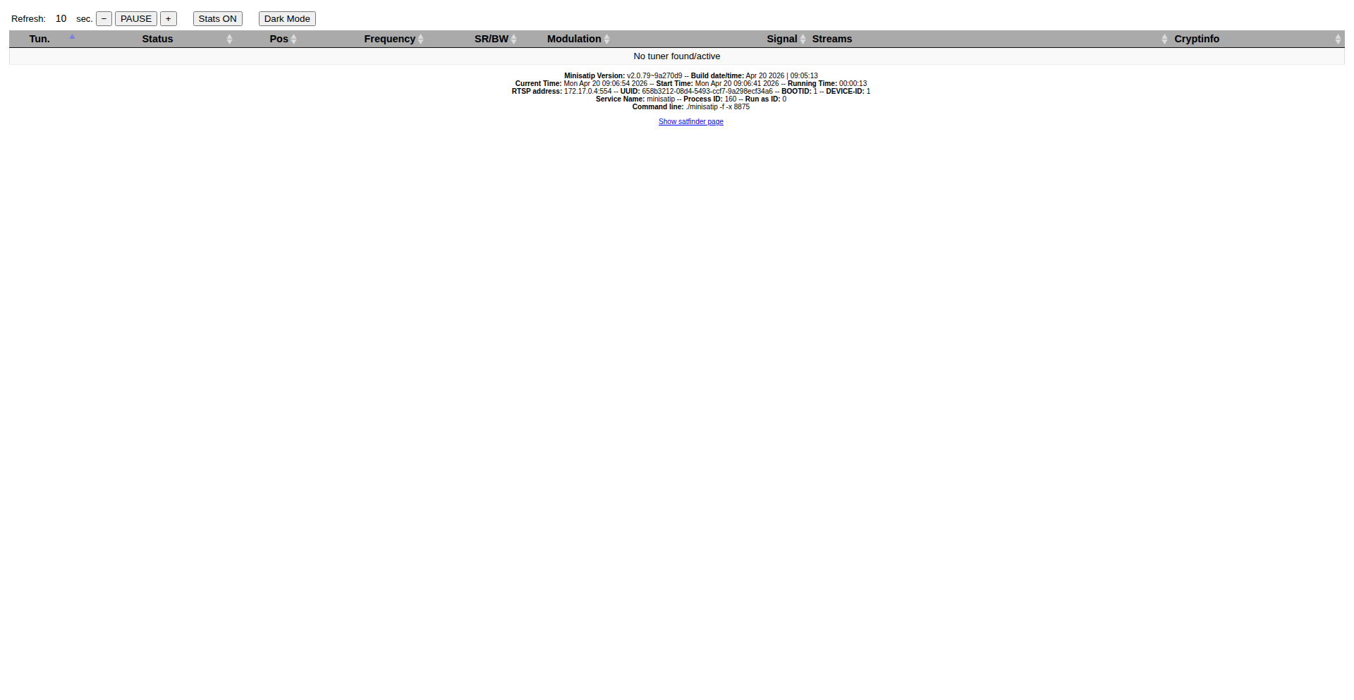 2026-04-20T09:06:49.825721656Z [20/04 09:06:49.825 main]: minisatip version v2.0.79~9a270d9, compiled on Apr 20 2026 09:05:18, with s2api version: 050C