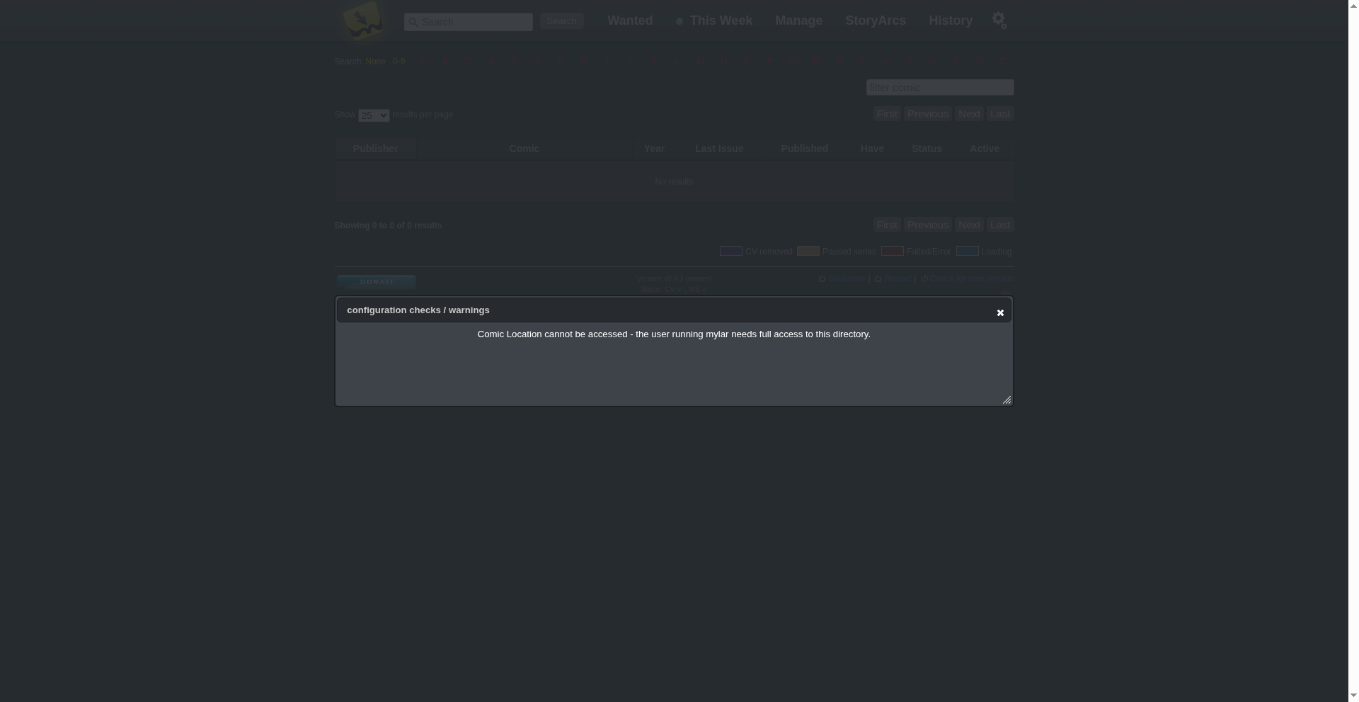 "message": "http://172.17.0.4:8090/home 349:24 \"config_check:failure\" \"\\u003Ccenter>Comic Location cannot be accessed - the user running mylar needs full access to this directory.\\u003C/br>\"",