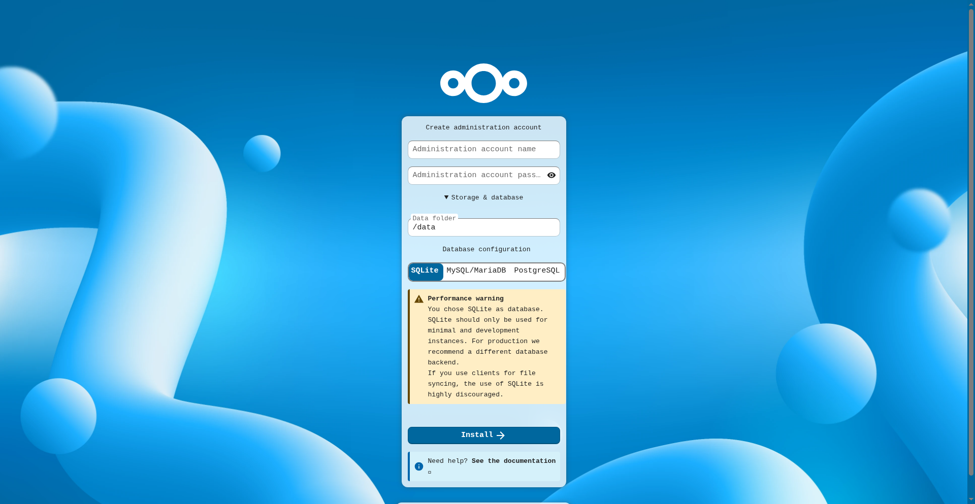 2025-11-18T11:58:36.521616746Z After completing the web-based installer, restart the Nextcloud container to apply default memory caching and transactional file locking configurations.