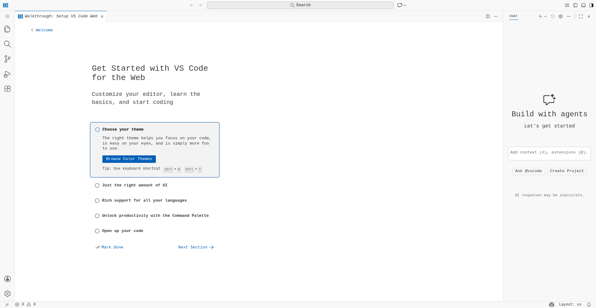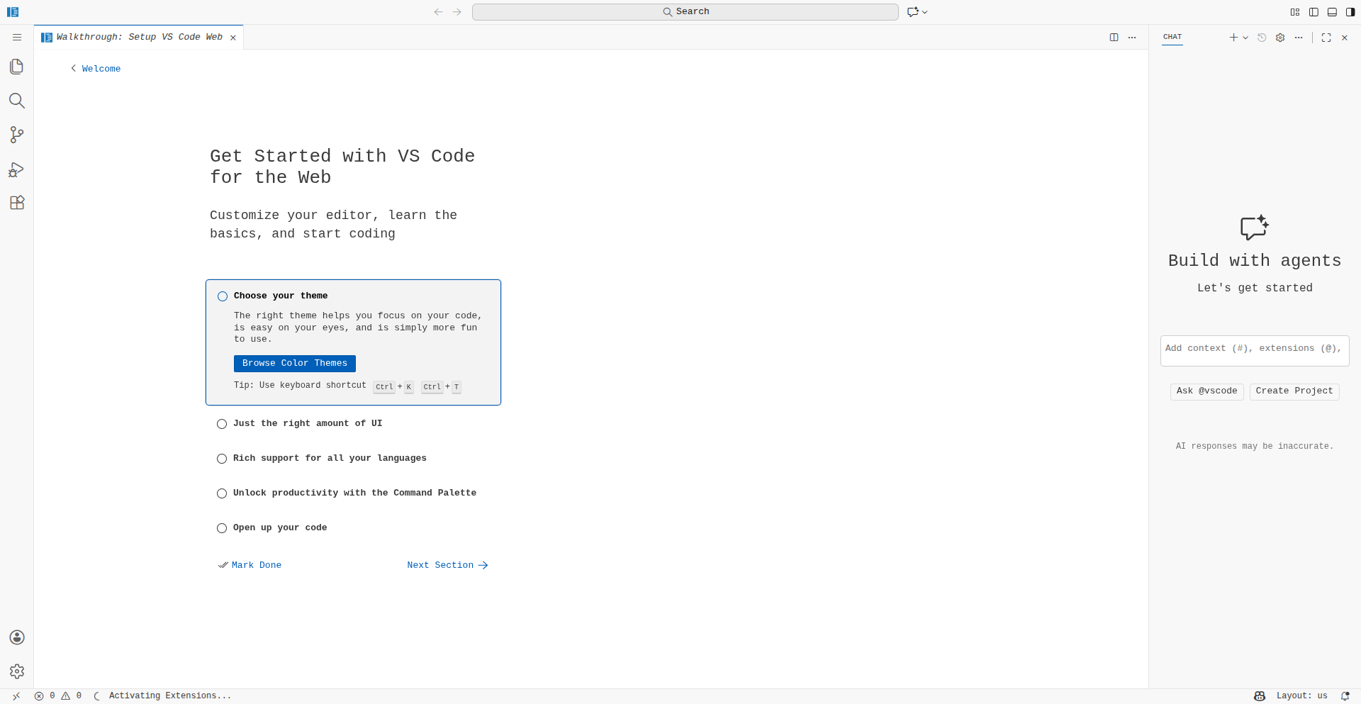 "message": "http://172.17.0.5:3000/insider-fb6055cb587de8c95dbd6e1619edaf77ec987ced/static/out/vs/code/browser/workbench/workbench.js 35:2860 \"%c ERR\" \"color: #f33\" CodeExpectedError: No default agent contributed\n at Lat.activateDefaultAgent (http://172.17.0.5:3000/insider-fb6055cb587de8c95dbd6e1619edaf77ec987ced/static/out/vs/code/browser/workbench/workbench.js:2228:12303)",