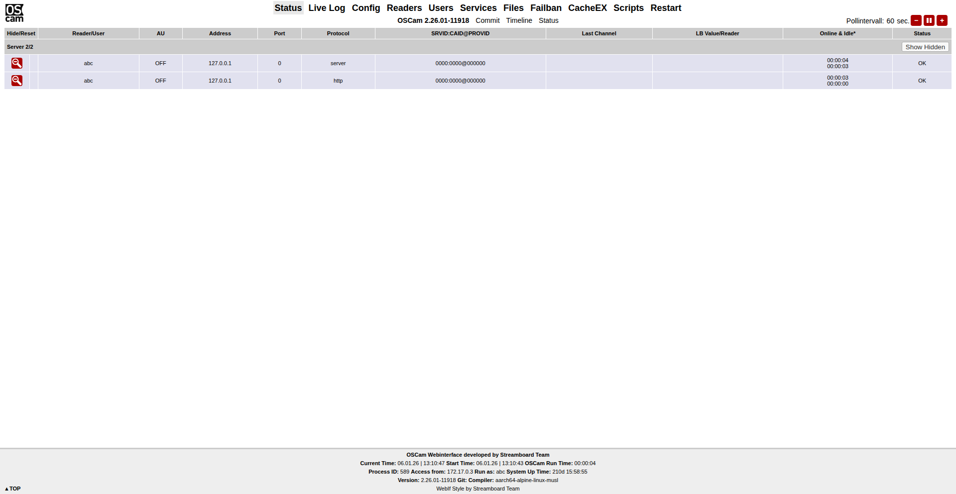 2026-01-06T13:10:43.926075659Z 13:10:43 00000000 s >> OSCam << cardserver log switched, version 2.26.01-11918@ (aarch64-alpine-linux-musl)