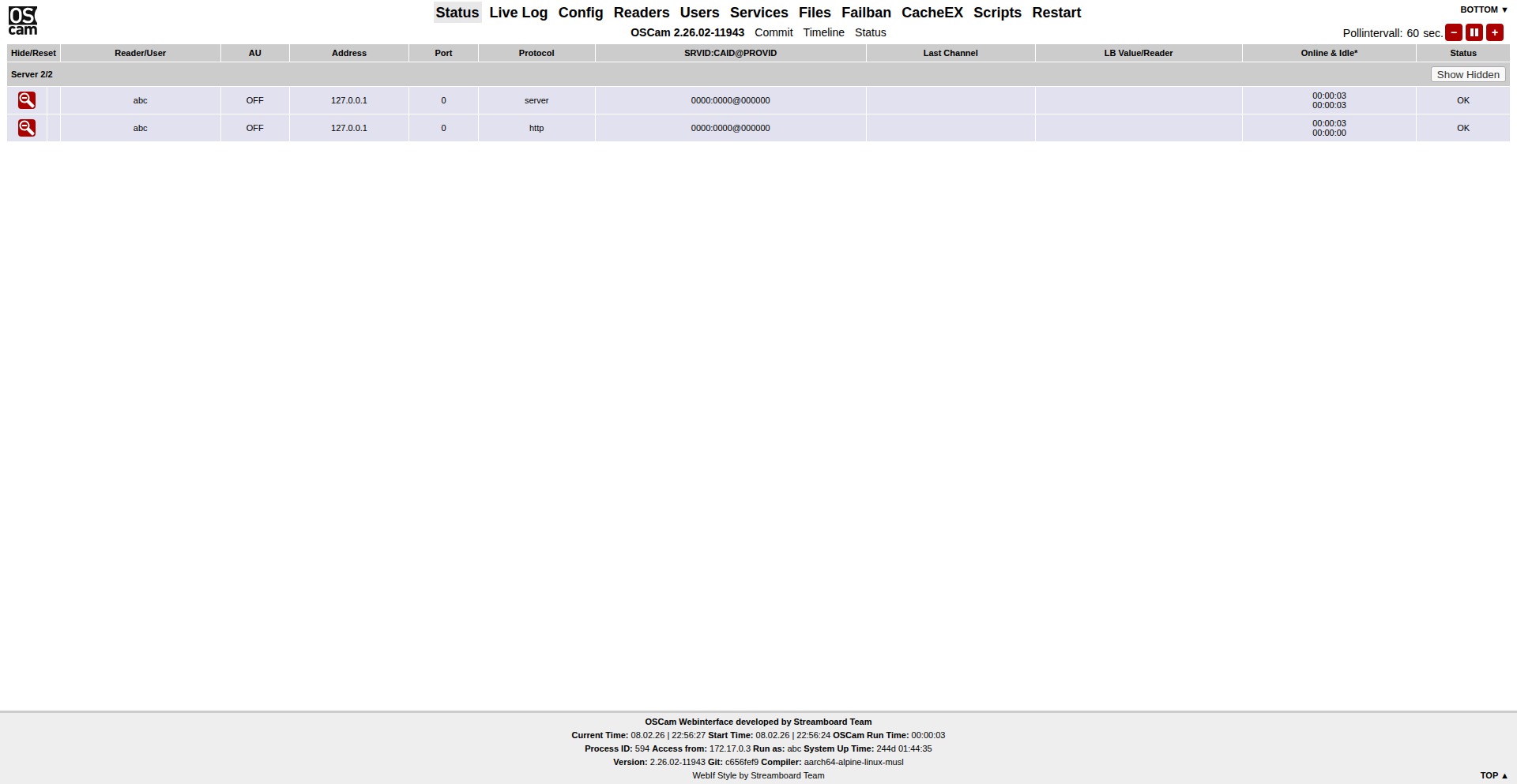 2026-02-08T22:56:19.312701069Z 22:56:19 00000000 s (main) creating pidfile /tmp/.oscam/oscam.pid with pid 173